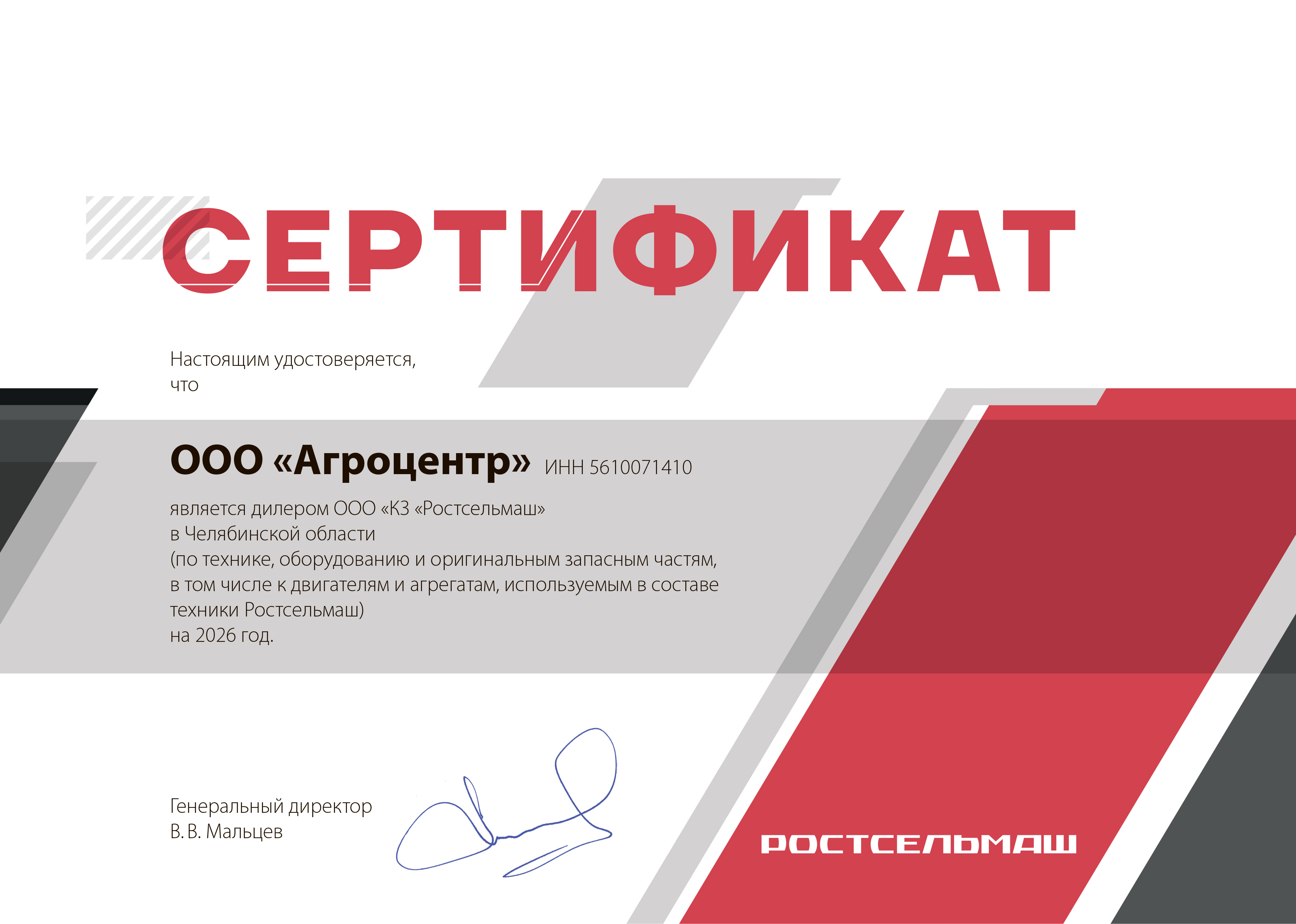 Сертификат дилера ООО "КЗ "РОСТСЕЛЬМАШ"" г. Челябинск
