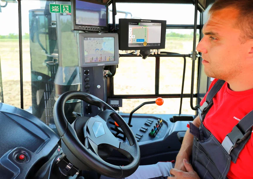 Еще одна полезная система — автоуправление РСМ Агротроник Пилот 1.0 — сама ведет машину по траектории, поддерживает оптимальную скорость, помогает в развороте техники. Можно сказать, что механизаторы теперь, по сути, становятся операторами: они лишь следят за работой техники.
